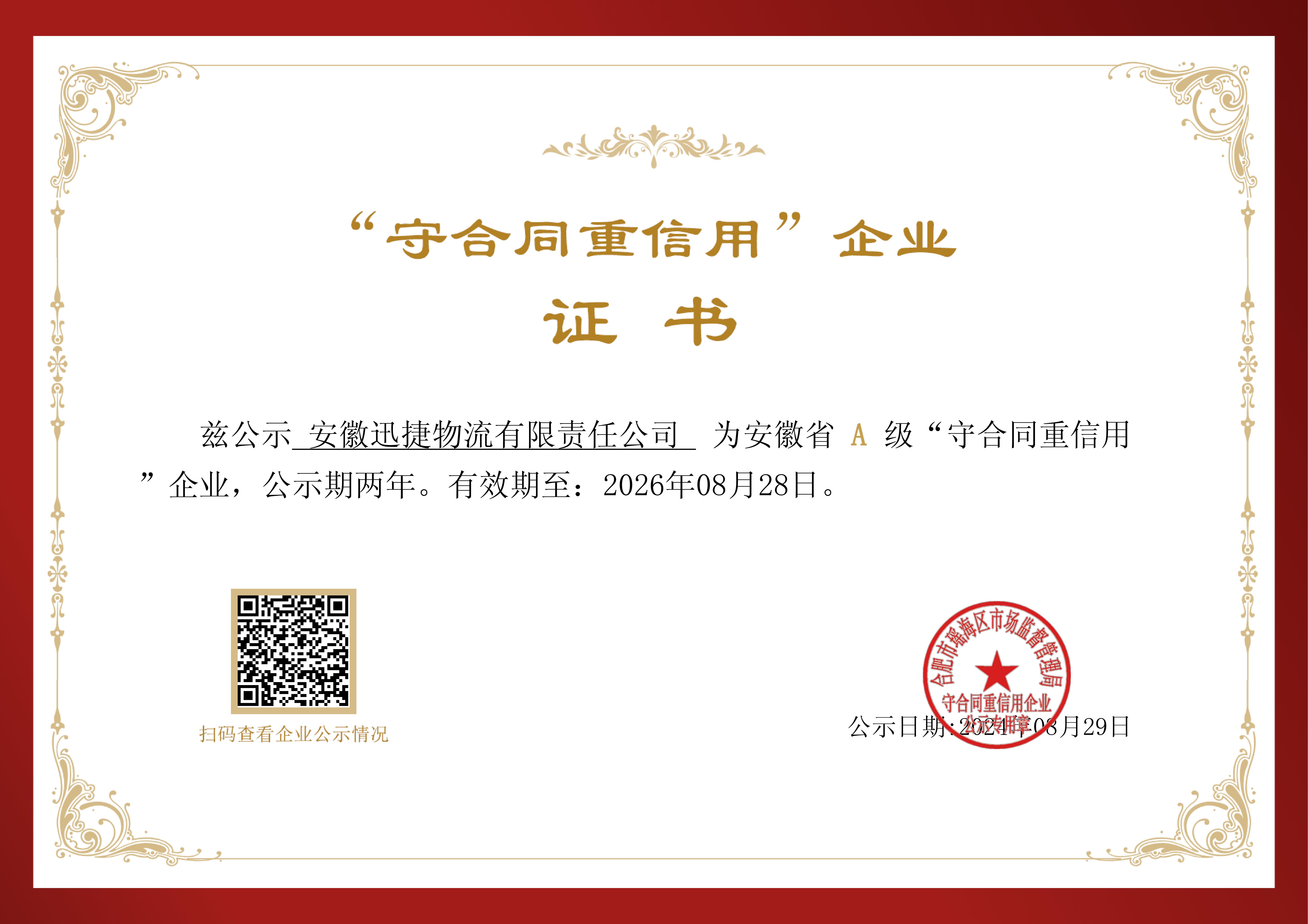 迅捷供應鏈公司獲評“AAA級重合同守信用企業(yè)”